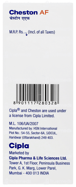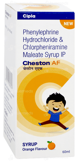Cheston Af New Orange Flavour Syrup 60ml is used to relieve symptoms associated with the common cold and allergies, such as nasal congestion, runny nose, sneezing, and watery eyes. Chlorpheniramine Maleate is an antihistamine that alleviates allergy symptoms, while Phenylephrine is a decongestant that reduces nasal congestion by narrowing blood vessels in the nasal passages.