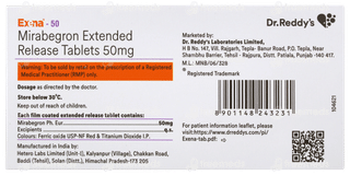 Exena-50 Tablet is primarily used to manage overactive bladder (OAB) syndrome. This medicine falls into the category of beta-3 adrenergic agonists.