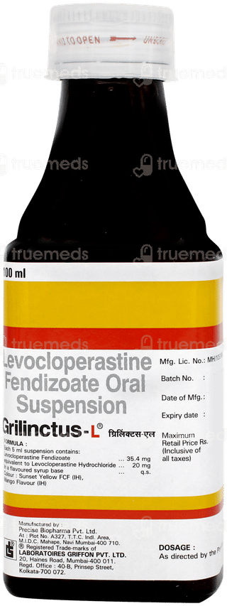 Grilinctus-L Suspension is used to relieve dry cough and symptoms associated with respiratory infections. It contains levocloperastine, an antitussive to ease coughing.
