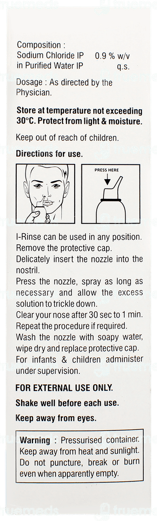 I-Rinse Nasal Spray 100 ml is used for managing and alleviating nasal congestion, primarily caused by conditions like the common cold or allergies. Comprising a purified salt solution, it functions by moisturising the nasal passages, helping facilitate the loosening of mucus, and providing rapid relief from congestion. This nasal spray helps target the inner surface of the nose, offering a quick and efficient means of combating stuffiness and discomfort associated with nasal congestion. Its mechanism of action involves moisturising the nasal lining, which helps to alleviate congestion caused by various factors such as colds, allergies, and pollution. I-Rinse Nasal Spray serves as a convenient and effective solution for individuals experiencing nasal congestion, offering relief and comfort by moisturising the nasal passages and facilitating the clearance of mucus. It is an essential addition to any regimen aimed at managing nasal congestion and promoting respiratory wellness.