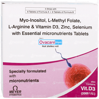 Ovacare Myo Combi Pack Tablet 12 is used for supporting hormonal balance, reproductive health and overall well-being. It contains essential micronutrients like iron, magnesium, and zinc, along with myo-inositol and vitamin D3, which may improve bone health and regulate hormonal functions. It helps in red blood cell formation and may assist in ensuring proper oxygen transport and reducing fatigue.