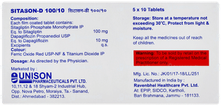 Sitason D 10/100 MG Tablet 10 is used to manage type 2 diabetes mellitus in adults whose blood sugar levels are inadequately controlled by diet and exercise alone. It combines dapagliflozin (a sodium-glucose co-transporter 2 inhibitor) and sitagliptin (a DPP-4 inhibitor) to lower blood glucose levels through different mechanisms.