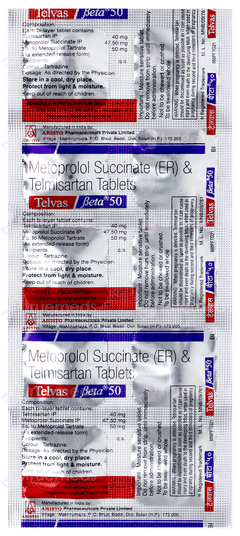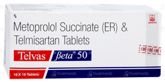 Telvas Beta 50 Tablet is used to manage high blood pressure and related heart conditions. It combines Telmisartan, which lowers blood pressure, with Metoprolol succinate, which reduces the heart's workload, improving overall heart health.