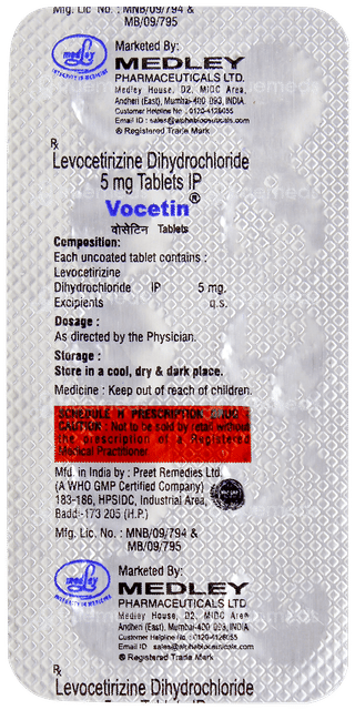 Vocetin Tablet 10 is used to treat allergic reactions such as sneezing, runny nose, itching, and watery eyes. This medicine belongs to the class of antihistamines (containing Levocetirizine) and works by blocking histamine, a chemical in the body responsible for causing allergy symptoms. By inhibiting histamine release, it provides fast relief for symptoms of allergic rhinitis (hay fever) and is also highly effective for urticaria (hives), which manifests as itchy, raised, red welts on the skin.