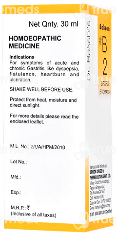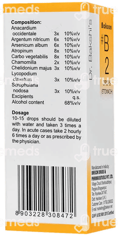 Bakson B2 Stomach Drop is used for relieving gas and acidity. It helps to relieve gastritis symptoms, including heartburn, ulceration and diarrhoea. It is especially beneficial for people who have complicated digestion, bloating or feeling full. It is formulated from Anacardium Occidentale, Chamomilla, Argentum Nitricum and Carbo Vegetabilis. These ingredients work together to help relieve gastrointestinal discomfort, nausea and vomiting, promoting overall digestive health.