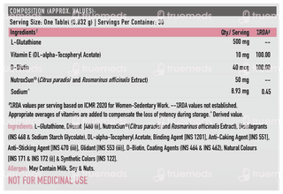 TrueBasics Glutathione 500mg Tablet is used for promoting healthy skin. It is a dietary supplement that helps to promote youthful skin. It features a powerful combination of L-Glutathione, a tripeptide with antioxidant properties, NutroxSun, a unique blend of botanical extracts, and essential nutrients like Biotin and Vitamin E. This potent formula helps combat free radical damage, supports skin brightening, and promotes overall skin health. TrueBasics Glutathione, 500mg tablets, offers a convenient way to add these powerful antioxidants to the daily regimen.