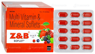 Z&b Softlet 15 is used for supporting overall health and well-being by addressing vitamin and nutritional deficiencies. It is formulated with a balanced blend of essential vitamins, minerals, and antioxidants, including Vitamin B6, Vitamin B12, Folic Acid, Zinc, Selenium, Chromium, Inositol, and Lycopene. This comprehensive formula boosts immune function, enhances energy production, and supports healthy skin, hair, and nails. It also helps in red blood cell formation, oxygen transport, and the metabolism of carbohydrates, proteins, and fats. Conveniently available in an easy-to-swallow softlet form, Z & B Soflet provides antioxidant protection to combat free radical damage.